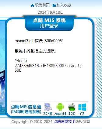 登錄點(diǎn)晴MIS提示:msxml3.dll錯(cuò)誤800c0005,系統(tǒng)未找到指定的資源。如何解決?這是當(dāng)前點(diǎn)晴MIS系統(tǒng)服務(wù)器不支持代碼所引用的ajax版本造成的,參考以下教程解決:【ASP】MSXML2.XMLHTTP組件AJAX訪問第三方頁面時(shí)報(bào)錯(cuò):系統(tǒng)無法找到指定的資源,如何解決?[495]http://24449....