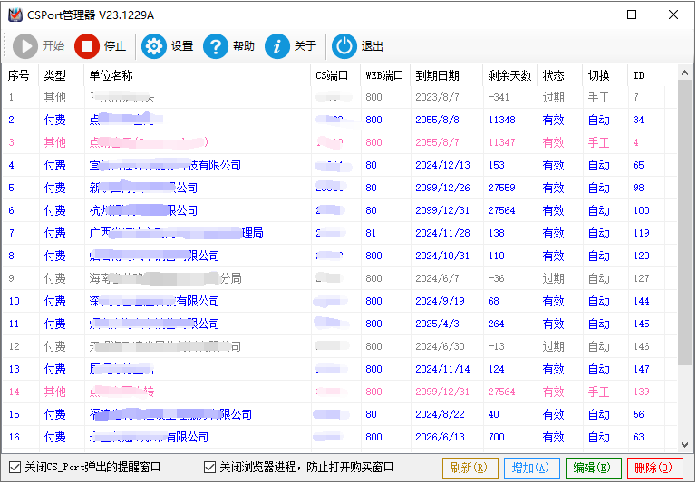 CS_Port管理器是深圳市點(diǎn)晴信息技術(shù)有限公司開發(fā)的一款內(nèi)網(wǎng)穿透管理程序,可以設(shè)置使用單位到期日期,到期后會(huì)自動(dòng)中斷內(nèi)網(wǎng)穿透服務(wù)。并且支持自動(dòng)檢測(cè)線路狀態(tài),如果內(nèi)網(wǎng)穿透服務(wù)不可用時(shí),會(huì)自動(dòng)重啟內(nèi)網(wǎng)穿透程序。界面說(shuō)明:?jiǎn)挝涣斜戆凑帐褂玫姆?wù)CS端口升序排序,單位狀態(tài)分為:過(guò)期和有效。過(guò)期的單位,整行文字為灰色。有效的單...