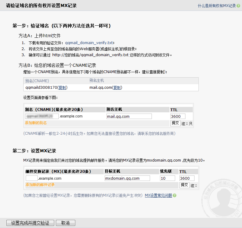 ![]() 第二步:選擇域名提供商 ![]() 第三步:上傳驗(yàn)證文件、添加MX記錄到mxdomain.qq.com(優(yōu)先級(jí)10),提交驗(yàn)證 ![]() 第四步:添加別名(CNAME)至mail.qq.com ![]() 好了,再?gòu)腝Q郵箱進(jìn)入域名郵箱,就可以添加成員了。每個(gè)成員都得和一個(gè)QQ號(hào)碼或QQ郵箱綁定,創(chuàng)建后對(duì)方QQ郵箱會(huì)收到一封邀請(qǐng)信,接受后TA就可以在http://mail.yourdomain.com/登錄并使用了域名郵箱了。 該文章在 2011/3/14 16:23:55 編輯過