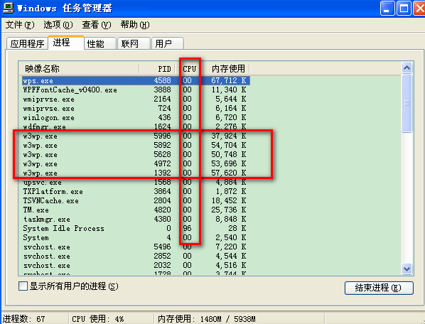 關(guān)于 IIS 的應(yīng)用程序池的配置,這里就不說(shuō)了,不懂的可以search 下 之后,再打開任務(wù)管理器,如下圖: