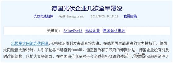 上述包括硅料在內(nèi)的四個制造端主要生產(chǎn)環(huán)節(jié)產(chǎn)量均連續(xù)位居全球第一位,其中太陽能電池組件已連續(xù)九年位居全球第一位。各環(huán)節(jié)產(chǎn)量前10名的企業(yè)中有半數(shù)以上位于中國。 光伏產(chǎn)業(yè)的全球龍頭是德國,一直到2008年,其全球市場份額還是世界第一,在中國企業(yè)的競爭下,德國光伏產(chǎn)業(yè)幾乎全行業(yè)破產(chǎn),博世和西門子賣掉或停止了太陽能業(yè)務(wù)。Solon、太陽能千年、Sovello、Conergy、Odersun等宣告破產(chǎn)。唯一幸存的大公司現(xiàn)在只有SolarWorld。該公司迫使債主放棄部分債務(wù)并贏得卡塔爾的大力投資,這才喘過氣來。其它企業(yè)雖然還有殘余或后續(xù)企業(yè),但它們都不是獨立企業(yè)。除了Solarworld外,德國太陽能工業(yè)幾乎已經(jīng)死亡。2013年底,德國太陽能產(chǎn)業(yè)只擁有4719個工作崗位。 2016年9月,只有3719名員工的德國solarworld宣布其德國工廠再次裁員500人。