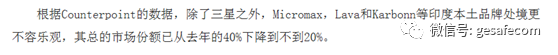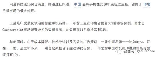 格力空調(diào)一家凈利潤就超過日本兩大龍頭空調(diào)企業(yè)之和,這在十年前是不可想象的。更何況中國還有其他兩個空調(diào)巨頭美的和海爾,其中美的的凈利潤率同樣高達13%,和格力不相上下。除了三巨頭以外,還有志高空調(diào),海信空調(diào)等二線品牌 中國空調(diào)產(chǎn)業(yè)曾經(jīng)產(chǎn)值和利潤都遠遠不如日本,而現(xiàn)在產(chǎn)值和利潤都大大超過了日本。 中國還在進一步擴大世界市場份額,以2016年上半年為例,格力空調(diào)出口增幅高達17億美元,增長24.5%。如果算上格力在巴西等海外工廠的銷售額,格力來自海外的銷售額更高。世界空調(diào)生產(chǎn)企業(yè)主要就是中國韓國日本,由于中國其他家電企業(yè)海外收入也在高速增長,格力出口的增長就是在擠壓日本韓國的份額。 中國不受待見,當(dāng)然主要原因是我們的奮起擠占了發(fā)達國家的利益空間,當(dāng)然我們也要認(rèn)識到一個問題,中國的發(fā)展不能和世界成為簡單的零和游戲,不能中國發(fā)展,全世界吃虧,這樣我們的發(fā)展絕對不會順利。 目前中國的產(chǎn)業(yè)鏈有這樣的趨勢,每進入一個行業(yè),就把這一個行業(yè)高中低端通吃,尤其是低端,直接做成白菜價,即讓發(fā)達國家的企業(yè)無法生存,又讓后面的發(fā)展中國家進入這個行業(yè)無利可圖,投資回報時間延長,工業(yè)化難度加大。 比如下面的這則新聞,在印度市場中國手機的崛起,2016年底占到了印度50%的市場份額,不只是韓國的份額被擠壓,印度本土手機的份額也從40%下降到20%。