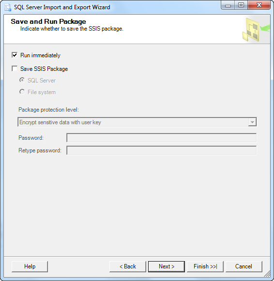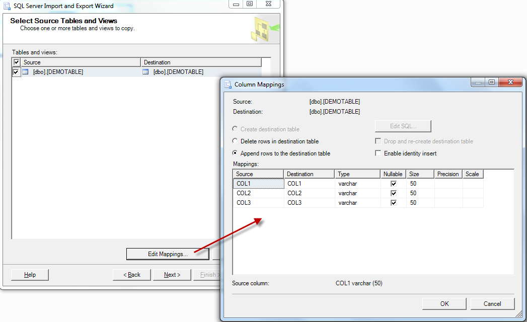 選擇“copy data from one or more tables or views” 選擇需要導(dǎo)數(shù)據(jù)的表,并且可以編輯列的Mapping關(guān)系。 可以選擇立即執(zhí)行或者存儲為SSIS的包,用于執(zhí)行計劃等其他用途。 這里我們選擇立即執(zhí)行。 注意導(dǎo)入的時候如果遇到如下的錯誤 Error 0xc02020f4: Data Flow Task: The column "Tel" cannot be processed because more than one code page (936 and 1252) are specified for it. 是因為兩邊的數(shù)據(jù)庫的Collation設(shè)置不一樣造成的,需要設(shè)置同樣的Collation。