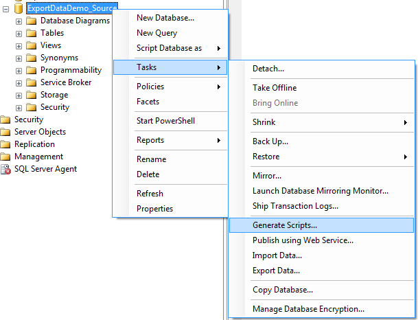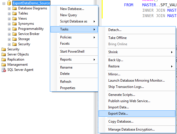 ![]() 01.使用SQL Server Import and Export Tool使用SQL Server Import and Export Tool進行數(shù)據(jù)的導(dǎo)出,也可以在目標(biāo)數(shù)據(jù)庫端使用Import進行導(dǎo)入,這部分套件也是SSIS的一部分。 在源數(shù)據(jù)庫上右鍵,選擇Task -> Export Data 分別填寫源數(shù)據(jù)庫和目標(biāo)數(shù)據(jù)庫的連接信息。