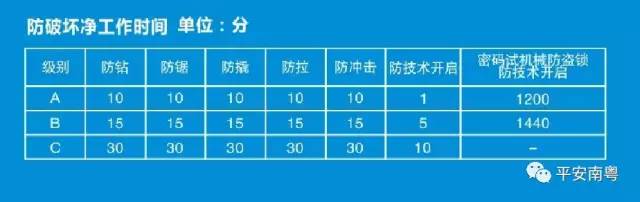 防破壞功能 下圖為鎖的防破壞凈工作時(shí)間表。使用規(guī)定的工具對(duì)機(jī)械防盜鎖實(shí)施防鉆、防鋸、防撬、防拉、防沖擊、防技術(shù)開啟實(shí)驗(yàn)和密碼式機(jī)械防盜鎖防技術(shù)開啟實(shí)驗(yàn),鎖被破壞、被打開的凈工作時(shí)間應(yīng)不少于下表的規(guī)定。