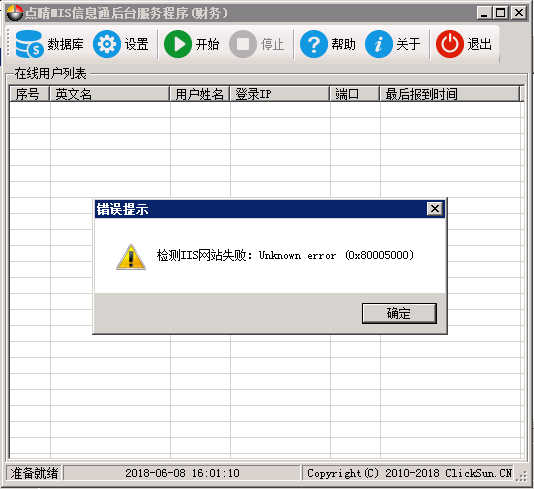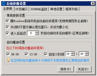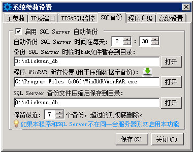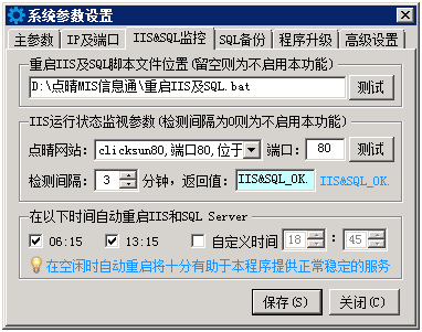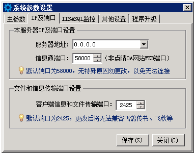 采用了阿里云服務(wù)器的使用單位要注意,阿里云的安全組設(shè)置相當(dāng)于Windows系統(tǒng)的防火墻,是對(duì)阿里云服務(wù)器的雙重保護(hù),但另一方面也造成了新手的不便,必須要開(kāi)啟阿里云的安全組允許通過(guò)58000端口才行,阿里云安全組設(shè)置方法參見(jiàn)教程: 如果確定已經(jīng)正常配置OA服務(wù)器防火墻、阿里云安全組,但是用戶端電腦還是無(wú)法顯示在上面的在線用戶列表中,那么應(yīng)該是后臺(tái)服務(wù)程序中設(shè)置的IP地址有誤,更改為地址0.0.0.0試試: 沒(méi)有特殊原因的話,以上地址務(wù)必使用:0.0.0.0,表示不區(qū)分接收IP,這是解決有外網(wǎng)和內(nèi)網(wǎng)用戶同時(shí)連接到OA服務(wù)器時(shí),能夠確保所有用戶電腦正常接收新信息推送提醒的唯一方法。 例如上面這臺(tái)服務(wù)器有三個(gè)網(wǎng)卡和IP地址,如果設(shè)置為內(nèi)外IP地址或外網(wǎng)IP地址,就都會(huì)導(dǎo)致只有連接到這個(gè)IP的用戶電腦可以正常使用,另外一些用戶無(wú)法使用。 ![]() 先點(diǎn)擊“停止”按鈕,然后點(diǎn)擊“設(shè)置”按鈕,進(jìn)入設(shè)置頁(yè)面: ![]() 上面幾項(xiàng)沒(méi)有特殊原因的話,務(wù)必都全部勾選。 以上端口沒(méi)有特殊原因的話,不應(yīng)該頻繁改動(dòng),否則會(huì)導(dǎo)致用戶PC客戶端連接異常,一般保持默認(rèn)的58000即可; 文件和信息傳輸端口設(shè)置為2425即可,更改為其他端口后將導(dǎo)致本程序無(wú)法兼容飛鴿傳書、飛秋等同類軟件,但可以確保在同一臺(tái)電腦上點(diǎn)晴MIS信息通PC客戶端與此類軟件共存并正常運(yùn)行。 ![]() 以上設(shè)置用于確保服務(wù)于點(diǎn)晴OA的IIS和SQL Server正常運(yùn)行。 開(kāi)啟方法: 1、點(diǎn)擊“重啟IIS及SQL腳本文件位置”的“測(cè)試”按鈕,確保腳本執(zhí)行正常,如果不正??梢宰孕行薷脑撃_本文件,具體內(nèi)容可以自行百度相關(guān)知識(shí); 2、點(diǎn)擊“IIS允許狀態(tài)監(jiān)視參數(shù)”-》“點(diǎn)晴網(wǎng)站”,選擇點(diǎn)晴MIS系統(tǒng)所在的網(wǎng)站,如果啟用了多端口,則需要自行修改“端口”為正確的端口,然后點(diǎn)擊“測(cè)試”按鈕,看看頁(yè)面返回值是否是“IIS&SQL_OK.”,必須是這個(gè)才是正確的; 3、在“在以下時(shí)間自動(dòng)重啟IIS和SQL Server”中,根據(jù)本單位上班時(shí)間勾選合適的自動(dòng)重啟時(shí)間,一般不沖突的話,就應(yīng)該全部勾選; 4、點(diǎn)擊“保存”按鈕后生效。 如果OA服務(wù)器的IIS和SQL Server是放在兩臺(tái)不同的服務(wù)器上,那么本項(xiàng)目應(yīng)該關(guān)閉不用。 關(guān)閉方法: 清空“重啟IIS及SQL腳本文件位置”、將將檢測(cè)間隔設(shè)置為0、“在以下時(shí)間自動(dòng)重啟IIS和SQL Server”全部取消。 如果進(jìn)入以上頁(yè)面提示以下錯(cuò)誤: 解決方法參見(jiàn):點(diǎn)晴MIS信息通后臺(tái)服務(wù)程序配置時(shí)提示錯(cuò)誤:檢測(cè)IIS網(wǎng)站失敗Unknown error(0x80005000),如何解決? ![]() SQL備份功能可以自動(dòng)備份點(diǎn)晴OA數(shù)據(jù)庫(kù)到指定位置,保留最近備份數(shù)量取決于硬盤剩余空間,剩余大的話,可以保留多一些,例如60(最近2個(gè)月)。 ![]() 點(diǎn)擊“關(guān)于”,就會(huì)看到是否有新版本,點(diǎn)擊下載,就可以下載升級(jí)包,解壓覆蓋即完成升級(jí)。 相關(guān)參考教程: