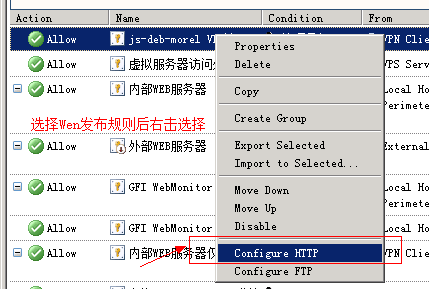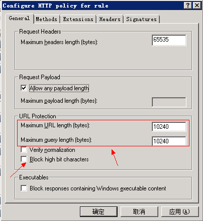 去掉了阻止高位選項的勾,然后增長了URL和查詢字串的可接受長度,至此問題解決! 方法 3(ISA防火墻): 1. Start the ISA Server Management tool. 2. Expand ServerName, where ServerName is the name of your ISA Server computer. 3. Click Firewall Policy, click the Web publishing rule that you created , and then click Edit Selected Rule. 4. Click the Traffic tab, click Filtering, and then click Configure HTTP. 5. Click to clear the Block high-bit characters check box, and then click OK two times. 6. Click Apply to update the firewall policy, and then click OK. 其實上面解決的問題就是,通過ISA發(fā)布網(wǎng)站之后,會導(dǎo)致Web地址里不能轉(zhuǎn)發(fā)高位字符,默認是被ISA給Block掉了! 按照上面的方法,大部份問題解決掉了,還有一個問題,那就是當(dāng)下載文件名中含.exe擴展名時,還是會出現(xiàn)這種錯誤,很明顯,.exe被block掉了,仔細看了一下,HTTP策略,發(fā)現(xiàn)在常規(guī)標簽中有一個:阻止包含windows可執(zhí)行文件內(nèi)容的響應(yīng)-》復(fù)選框,取消即問題解決!