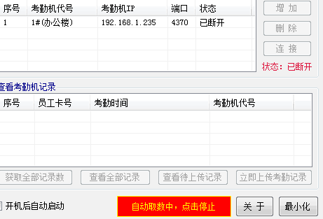 :為什么打開考勤取數(shù)程序看到的總是自動(dòng)斷開連接的?![]() ![]() 正?,F(xiàn)象,考勤機(jī)取數(shù)程序不是時(shí)時(shí)刻刻和考勤機(jī)保持連接的,是定期連接到考勤機(jī)上取數(shù)的,所以正常情況下,看到的就是斷開的狀態(tài),只在設(shè)定的時(shí)間間隔時(shí),才會(huì)連接到考勤機(jī)上取數(shù)。