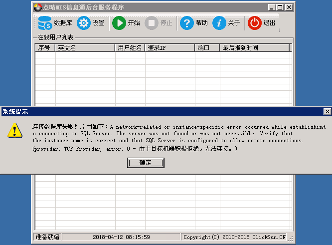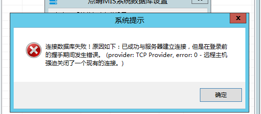 重啟OA服務(wù)器時(shí)點(diǎn)晴MIS信息通后臺(tái)服務(wù)程序提示錯(cuò)誤:連接數(shù)據(jù)庫失?。≡蛉缦拢河捎谀繕?biāo)機(jī)器積極拒絕,無法連接。要如何解決?