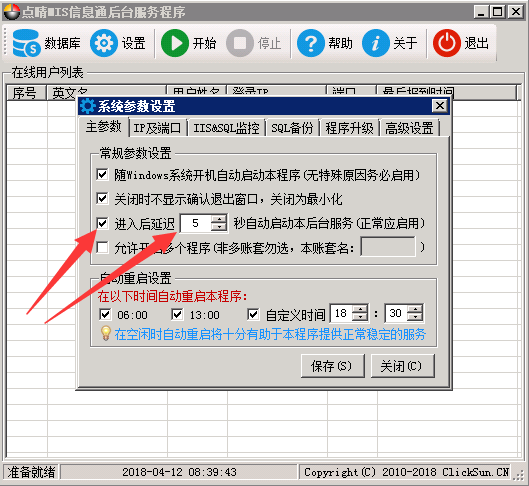:重啟OA服務(wù)器時(shí)點(diǎn)晴MIS信息通后臺(tái)服務(wù)程序提示錯(cuò)誤:連接數(shù)據(jù)庫失敗!原因如下:由于目標(biāo)機(jī)器積極拒絕,無法連接。要如何解決?![]() ![]() ![]() 先點(diǎn)擊上面的“數(shù)據(jù)庫”-》“測試并保存”按鈕,看看能否正常連接到OA服務(wù)器數(shù)據(jù)庫。 ![]() 如果無法正常連接到SQL Server數(shù)據(jù)庫,那么就應(yīng)該是OA服務(wù)器數(shù)據(jù)庫未正常啟動(dòng),將數(shù)據(jù)庫啟動(dòng)再重試,或者檢查是否連接數(shù)據(jù)庫參數(shù)配置有誤(有可能是網(wǎng)管更改過數(shù)據(jù)庫連接密碼)。 如果可以正常連接到SQL Server數(shù)據(jù)庫,那么就是沒設(shè)置延遲時(shí)間或設(shè)置的延時(shí)啟動(dòng)時(shí)間不夠!出現(xiàn)這個(gè)錯(cuò)誤的原因是點(diǎn)晴MIS后臺(tái)服務(wù)程序已經(jīng)啟動(dòng)完畢,但你的服務(wù)器配置估計(jì)不太好,SQL Server服務(wù)還沒啟動(dòng)成功,導(dǎo)致連接失敗。
