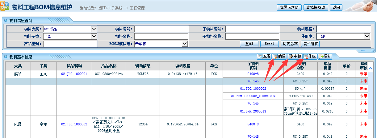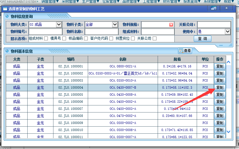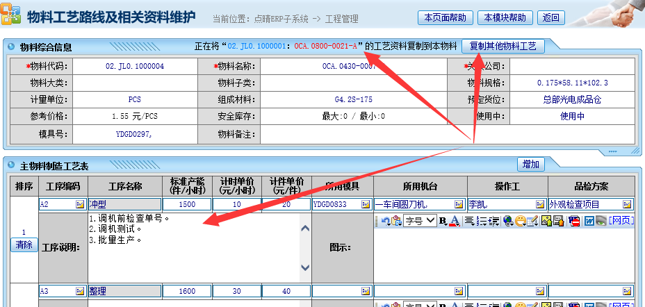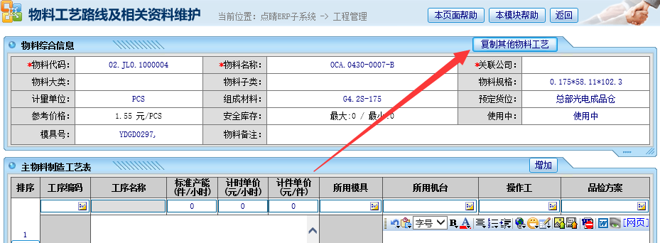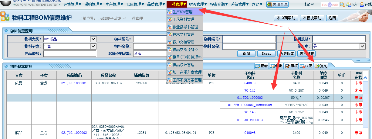 請問點晴模切ERP中是否有物料BOM和工藝資料復制功能?在哪里?