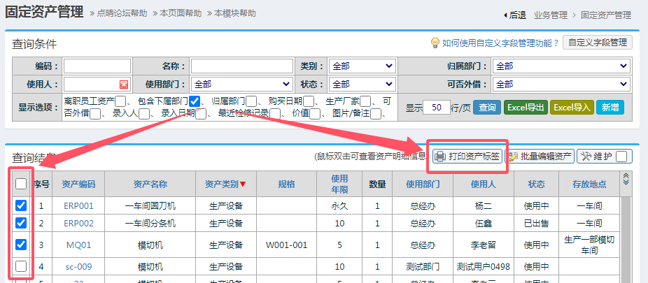 :請(qǐng)問固定資產(chǎn)管理模塊中是否支持打印二維碼或一維條形碼管理?![]() 可以打印,進(jìn)入固定資產(chǎn)管理模塊,勾選需要打印標(biāo)簽的資產(chǎn),然后點(diǎn)擊“打印資產(chǎn)標(biāo)簽”即可: