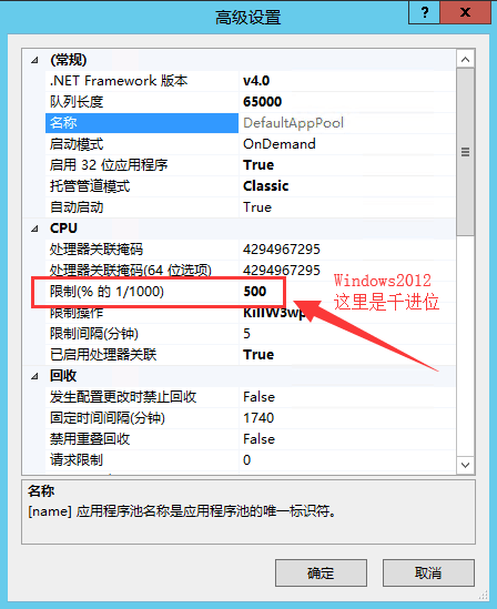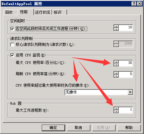 CPU的限制一般設(shè)置為30000即可,這個(gè)值使用CPU的占用百分比*1000得出,一般這個(gè)占用比不應(yīng)該超過(guò)50%,即不超過(guò)50000,限制操作設(shè)置為:KillW3wp,即超過(guò)了就殺掉IIS進(jìn)程,限制間隔設(shè)置為:5 分鐘,切勿設(shè)置為0,已啟用處理器關(guān)聯(lián)設(shè)置為:True。