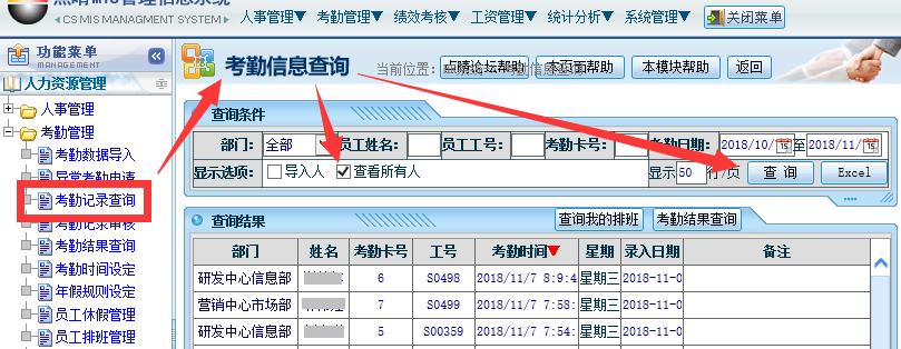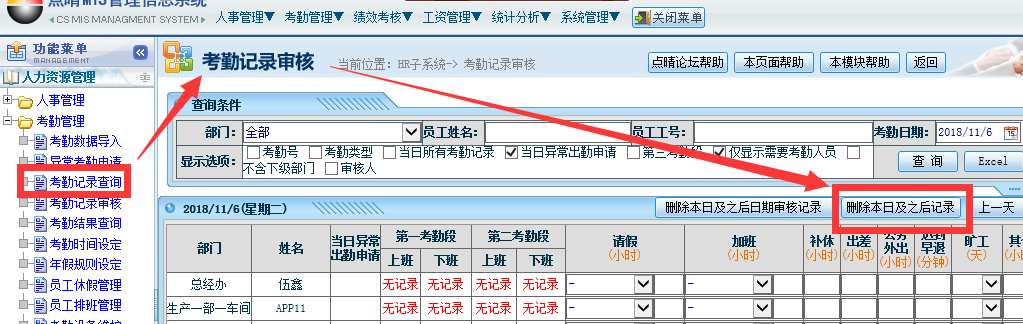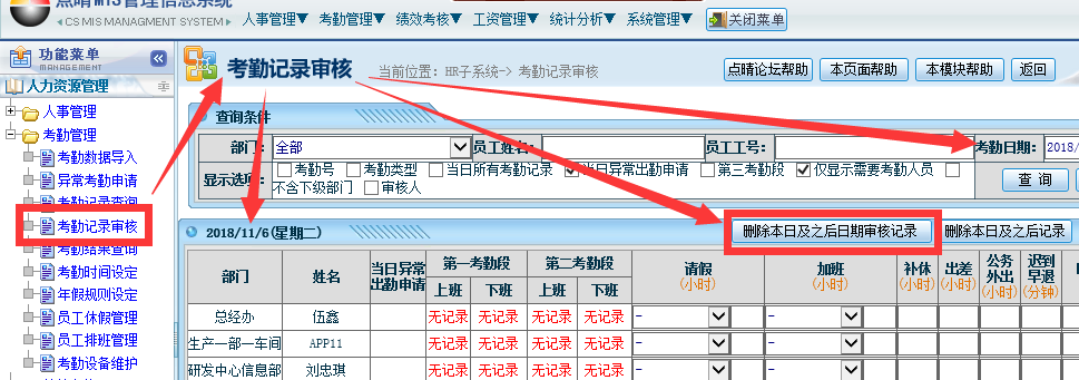:考勤機(jī)是正常的,在考勤記錄查詢中可以看到,但考勤記錄審核列表中沒(méi)有最近時(shí)間的考勤,如何解決?![]() 如果在“考勤記錄審核”頁(yè)面看不到員工的考勤記錄時(shí)間,那么先進(jìn)入“考勤記錄查詢”頁(yè)面,檢查這段空白的時(shí)間中考勤機(jī)是否已經(jīng)將考勤記錄傳輸進(jìn)來(lái)。勾選“查所有人”后,點(diǎn)擊查詢: 如果在上面考勤管理的“考勤記錄查詢”頁(yè)面中沒(méi)有找到最近時(shí)間的考勤記錄,那么進(jìn)入點(diǎn)擊菜單“考勤記錄審核”,進(jìn)入相應(yīng)頁(yè)面: 將日期切換到?jīng)]有記錄之日期,然后點(diǎn)擊按鈕“刪除本日及之后記錄”,就會(huì)自動(dòng)清除出問(wèn)題的數(shù)據(jù),重新從考勤機(jī)中拉取考勤數(shù)據(jù)。 如果在上面考勤管理的“考勤記錄查詢”頁(yè)面中可以看到最近時(shí)間的考勤記錄,那么進(jìn)入點(diǎn)擊菜單“考勤記錄審核”,進(jìn)入相應(yīng)頁(yè)面: 將日期切換到?jīng)]有記錄之日期,然后點(diǎn)擊按鈕“刪除本日及之后日期審核記錄”,就會(huì)自動(dòng)清除出問(wèn)題的數(shù)據(jù),重新從考勤機(jī)中拉取考勤數(shù)據(jù)。 特別說(shuō)明: 請(qǐng)注意以上兩種情況的區(qū)別,一個(gè)是在考勤記錄查詢中看到考勤記錄,一個(gè)是在考勤記錄查詢中看不到記錄,不要弄錯(cuò)。