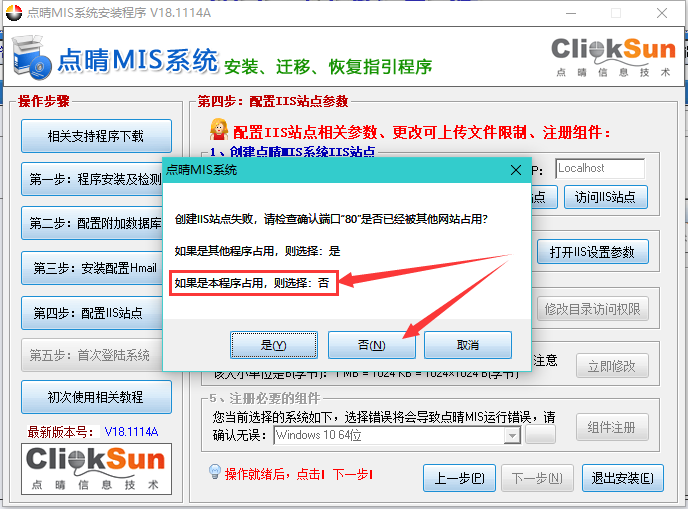 點(diǎn)晴MIS半自動(dòng)安裝程序提示請(qǐng)確認(rèn)80端口是否被占用,如何解決?