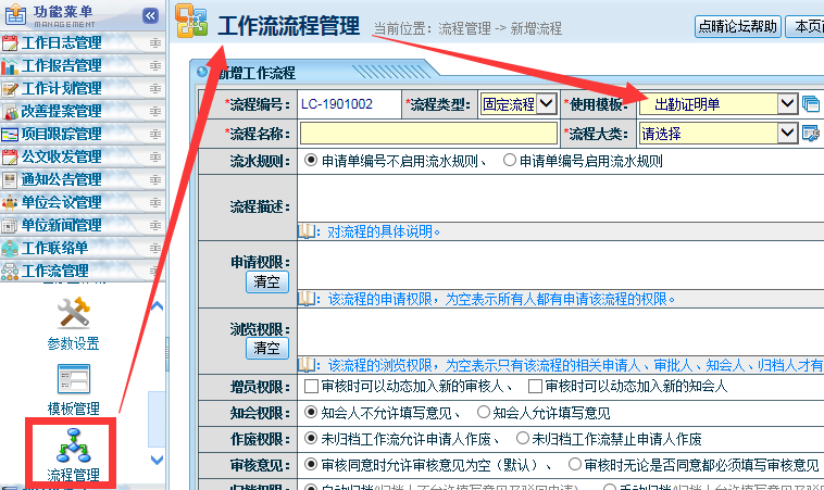 注意,必須用點晴OA中預置的出勤證明模板來設計工作流申請,自己創(chuàng)建的普通模板是無法事先審核結果自動匯入人力資源模塊的考勤管理中的。