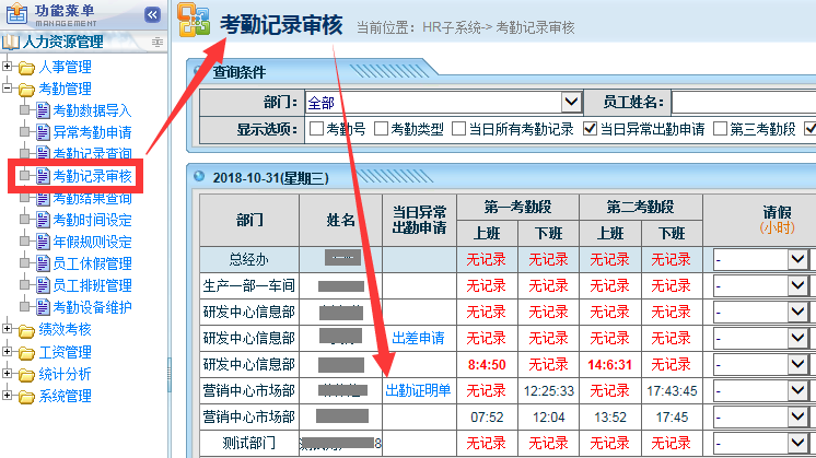 出勤證明申請通過后,就會在人力資源模塊的考勤管理審核中看到這個申請記錄了。