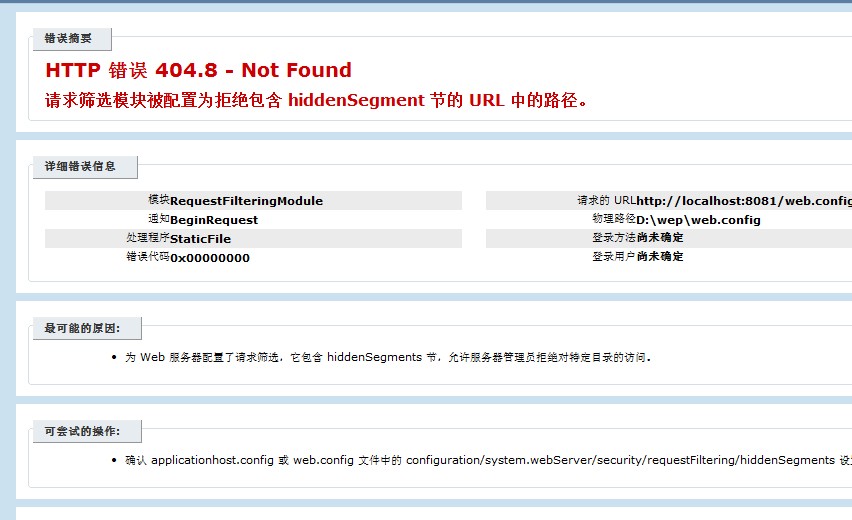 :打開網(wǎng)頁下載文件時提示錯誤:請求篩選模塊被配置為拒絕包含hiddenSegment節(jié)的URL中的路徑。如何解決?