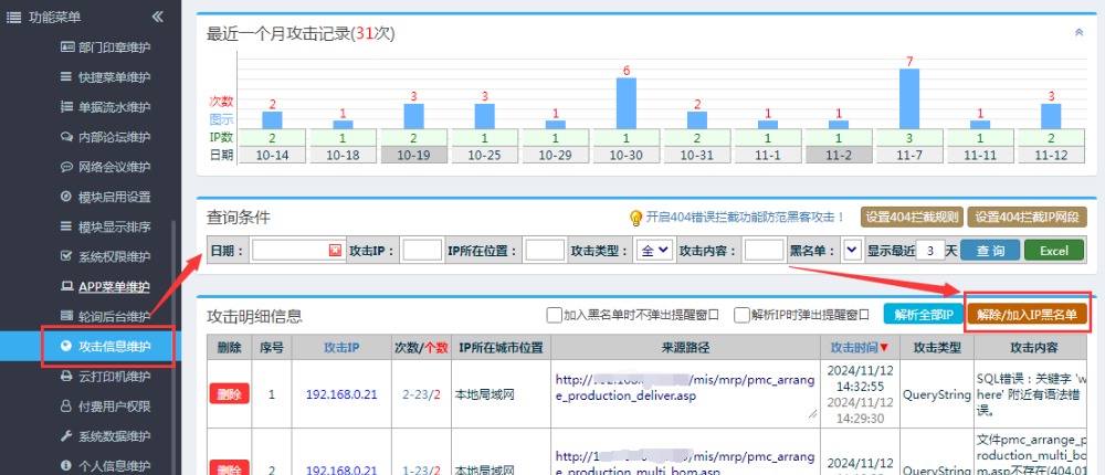 、在電腦上解除黑名單封鎖方法如果確定當(dāng)前電腦的確沒有產(chǎn)生非法攻擊行為,找到一臺能夠正常登陸點晴MIS系統(tǒng)的電腦(找不到就直接用遠(yuǎn)程桌面登錄到OA服務(wù)器,在服務(wù)器上打開瀏覽器,通過 http://127.0.0.1:***/ 訪問,***為實際使用的端口號),打開瀏覽器,以管理員身份(必須用管理員賬戶登錄)登錄點晴MIS系統(tǒng),進(jìn)入:點晴MIS系統(tǒng)-》設(shè)置-》系統(tǒng)維護(hù)設(shè)置-》攻擊信息維護(hù)-》攻擊明細(xì)信息,在以下位置可以看到攻擊OA服務(wù)器的具體內(nèi)容,如需解除該電腦的訪問限制,點擊按鈕“解除/加入IP黑名單”:
