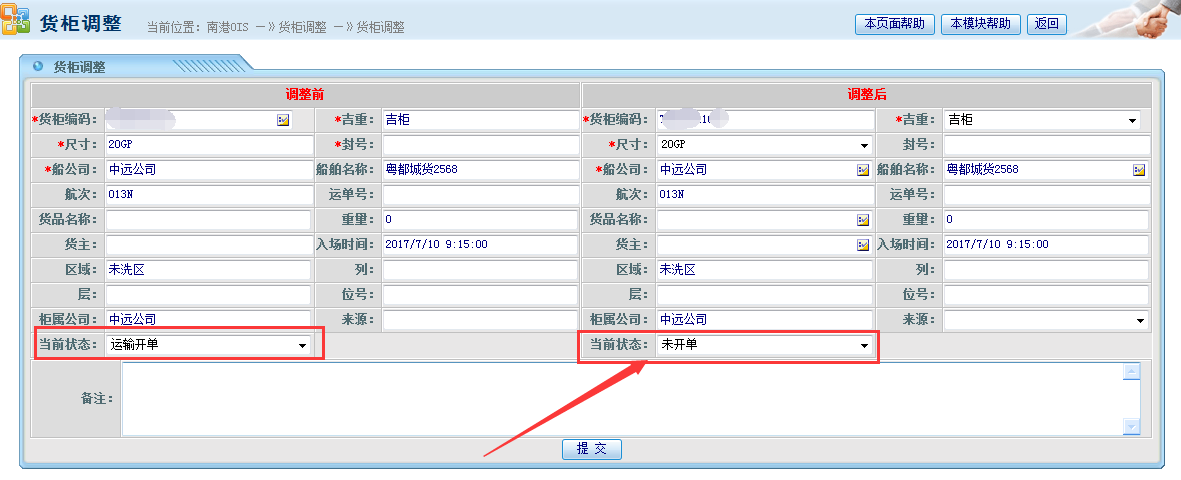 步驟1、貨柜調(diào)整操作,操作步驟:堆場管理——貨柜管理——貨柜調(diào)整——選擇對應(yīng)的柜號——將調(diào)整后的當前狀態(tài)改成“未開單”狀態(tài)——提交,如下圖所示: