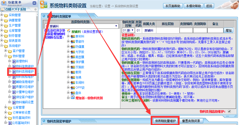 找到物料類別維護菜單,進入后,在下面會看到按鈕“保質(zhì)期批量維護”,點擊即可進入: