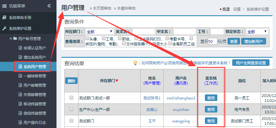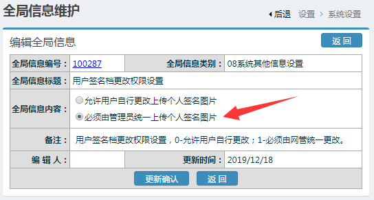 ![]() 可以,進入點晴OA-》設置-》系統(tǒng)維護設置-》系統(tǒng)維護管理-》全局信息維護-》系統(tǒng)其他信息設置: ![]() ![]() 如果設置為“允許用戶自行更改上傳個人簽名圖片”(本項目為系統(tǒng)默認值),就可以允許用戶自行管理本人的簽名檔了。 如果設置為“必須由管理員統(tǒng)一上傳個人簽名圖片”,用戶個人就無法自行設置啟用個人簽名檔圖片了,必須由管理員進入以下位置維護: ![]() 管理員點擊按鈕“禁用”,就可以進入設置頁面,啟用并上傳用戶提供的個人簽名檔圖片或頭像了: ![]() 該文章在 2020/4/4 0:17:17 編輯過 |