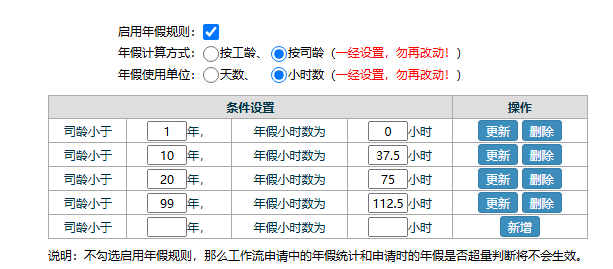 考勤管理-年假規(guī)則設(shè)定-設(shè)置并啟用年假規(guī)則;注意:選定了計(jì)算單位后不可再改動(dòng)!