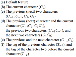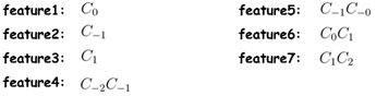 3.3 基于字標(biāo)注的平均感知機(jī)分詞方法3.3.1 特征設(shè)計我們選擇5個字為上下文窗口大小,即: