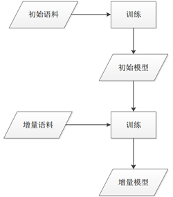 ![]() 圖6 訓(xùn)練算法偽代碼 3.3.3 增量訓(xùn)練在增量訓(xùn)練中,首先使用初始訓(xùn)練語料訓(xùn)練一個初始模型,然后結(jié)合初始模型以及增量語料進(jìn)行增量訓(xùn)練得到一個增量模型。增量訓(xùn)練可以提高分詞系統(tǒng)的領(lǐng)域適應(yīng)性,進(jìn)一步提高切分中文分詞準(zhǔn)確率, 同時避免了對初始語料的需求以及使用全部語料訓(xùn)練模型所需要的時間。[8]模型增量訓(xùn)練流程圖如圖7所示: