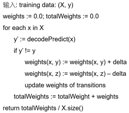 圖5 預(yù)測算法偽代碼 在使用隨機(jī)梯度下降法的訓(xùn)練過程中,我們采取平均化參數(shù)方法防止某一訓(xùn)練數(shù)據(jù)對結(jié)果影響較大。訓(xùn)練算法的偽代碼如圖6所示。