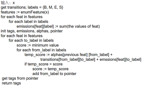 圖4 字的特征設(shè)計 3.3.2 算法設(shè)計對于預(yù)測算法而言,如果是簡單的序列標(biāo)注問題,那么取得分最高的標(biāo)簽即可,但是在中文分詞問題中,當(dāng)前字的標(biāo)簽與前一個字的標(biāo)簽密切相關(guān),例如若前一個字標(biāo)簽為S(單字成詞),則當(dāng)前字的標(biāo)簽只可能為S或B(詞首),為了利用上述信息,我們引入狀態(tài)轉(zhuǎn)移和Viterbi算法。預(yù)測算法的偽代碼如圖5所示。