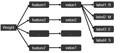 由于感知機(jī)的基本形式是二分類的,而字標(biāo)注為四分類(多分類)。為了基于感知機(jī)實現(xiàn)多分類,將每個字的某一特征權(quán)重設(shè)計為長度為4的向量,向量的每個分量對于某一分類的權(quán)值,如圖4所示。