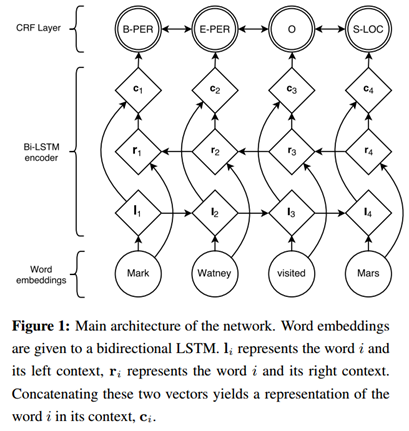 《Neural Architectures for Named Entity Recognition》一文中提出了一種深度學(xué)習(xí)框架,如圖3,利用該框架可以進(jìn)行中文分詞。具體地,首先對語料的字進(jìn)行嵌入,得到字嵌入后,將字嵌入特征輸入給雙向LSTM,輸出層輸出深度學(xué)習(xí)所學(xué)習(xí)到的特征,并輸入給CRF層,得到最終模型。[9]