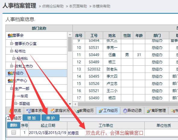 :請(qǐng)問點(diǎn)晴OA中人事系統(tǒng)員工的明細(xì)信息錯(cuò)誤怎么更改?![]() 注意頁面上的構(gòu)成元素,點(diǎn)擊維護(hù)按鈕,會(huì)彈出刪除按鈕,雙擊所在行,會(huì)彈出編輯窗口: ![]() 該文章在 2020/4/4 0:25:52 編輯過 |