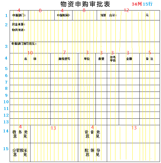 ![]() 2、設(shè)計(jì)表格前,應(yīng)該研究此表格構(gòu)成,像上面這個(gè)表格,一共是15行,因?yàn)椴捎昧丝v向設(shè)計(jì),縱向時(shí)單元格一共有34列,要考慮如何分配各列占用的單元格列數(shù)為宜,下面紅色數(shù)字是此列單元格計(jì)劃占用的列數(shù)、藍(lán)色數(shù)字為計(jì)劃占用的行數(shù),所以上面表格模板控件會(huì)話框中表格列數(shù)應(yīng)該用縱向34列、表格行數(shù)為15行: