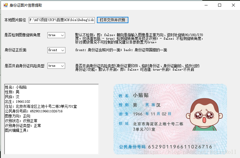 3.識(shí)別后的json內(nèi)容進(jìn)行輸出 /// <summary> /// 在界面上顯示 /// </summary> /// <param name="returnstr">json內(nèi)容</param> public void WriteTo(string returnstr) { try { ReturnJsonForCard rj = CYQ.Data.Tool.JsonHelper.ToEntity<ReturnJsonForCard>(returnstr); AReturnJsonForCard acj = CYQ.Data.Tool.JsonHelper.ToEntity<AReturnJsonForCard>(rj.words_result); string resultstr = ""; resultstr += "姓名:"+acj.姓名.words + "\r\n"+ "性別:" + acj.性別.words + "\r\n"+ "民族:" + acj.民族.words + "\r\n"+ "出生:" + acj.出生.words + "\r\n"+ "住址:" + acj.住址.words + "\r\n"+ "公民身份號(hào)碼:" + acj.公民身份號(hào)碼.words + "\r\n"; string card_direction = ""; if(rj.direction=="-1") { card_direction = "未定義"; } else if (rj.direction == "0") { card_direction = "正向"; } else if (rj.direction == "1") { card_direction = "逆時(shí)針90度"; } else if (rj.direction == "2") { card_direction = "逆時(shí)針180度"; } else if (rj.direction == "3") { card_direction = "逆時(shí)針270度"; } resultstr += "圖像方向:" + card_direction + "\r\n";