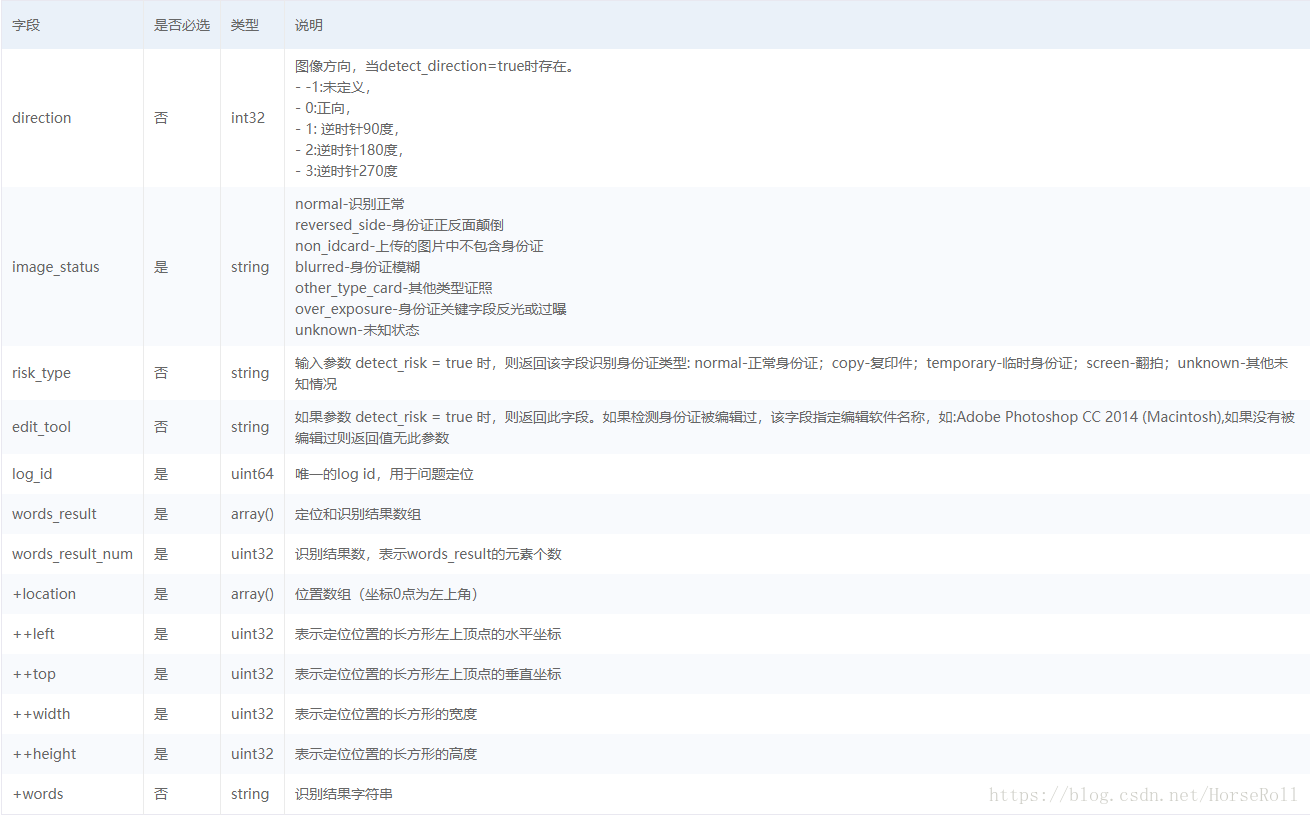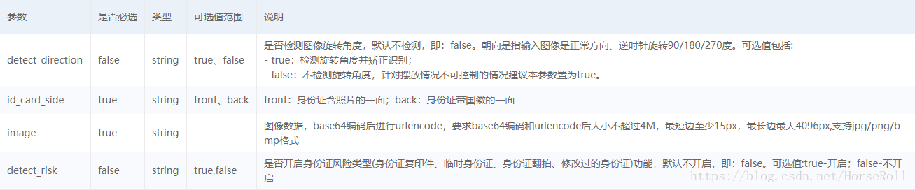 之前寫(xiě)了一篇利用百度OCR進(jìn)行本地和網(wǎng)絡(luò)圖片識(shí)別文字的文章,點(diǎn)擊查看。今天補(bǔ)充識(shí)別身份證圖片的文章及demo 源碼地址:https://download.csdn.net/download/horseroll/10922409 效果圖展示: 請(qǐng)求參數(shù): 返回參數(shù):