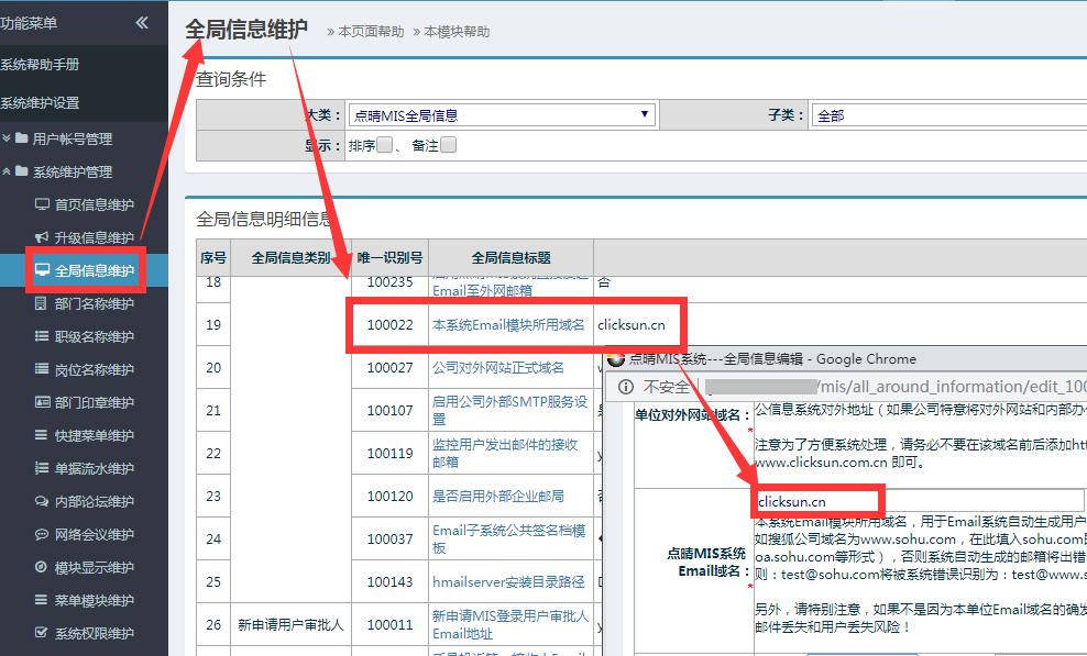 ![]() Email地址中@的前面部分“zhangsan”不允許更改,是用戶身份唯一識別ID,后面的域名“lynnkris.com”可以由管理員在系統(tǒng)維護(hù)中統(tǒng)一一次性更改為“test.com”,更改位置如下: ![]() 該文章在 2020/6/19 12:26:11 編輯過 |