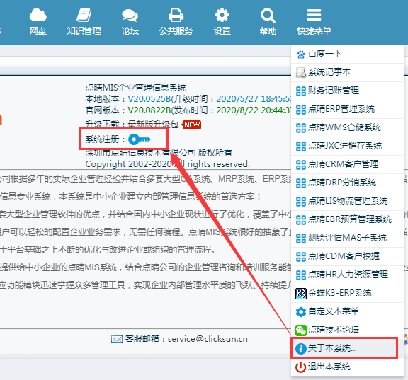 點(diǎn)擊點(diǎn)晴OA系統(tǒng)快捷菜單-》關(guān)于本系統(tǒng)...: