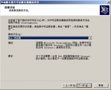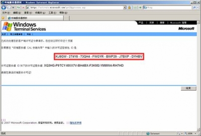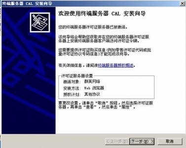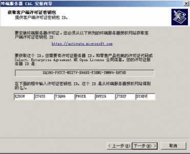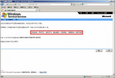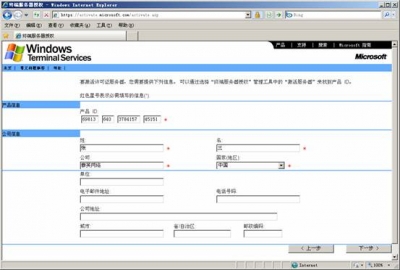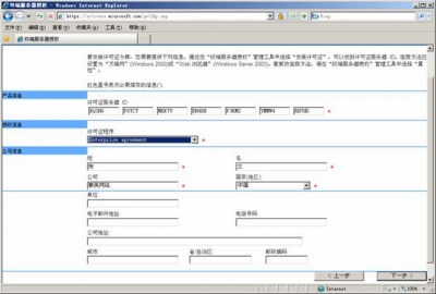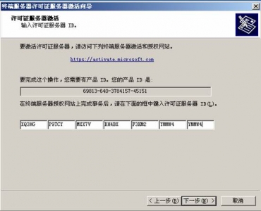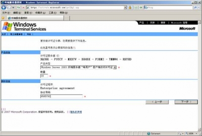 ![]() 在隨后要求提供的信息界面中,“產(chǎn)品ID”處輸入剛才抄下的那個(gè)20位數(shù)字,再填入自己的其他基本資料,然后再選“下一步”繼續(xù)。此時(shí)系統(tǒng)會(huì)顯示你方才輸入的個(gè)人信息,確信無誤之后再“下一步”。 ![]() 你便可以得到“已成功處理您的許可證服務(wù)器啟動(dòng)申請(qǐng)。你的許可證ID是”XQ3HG - P9TCY - MXX7V - BH4BX - F3KM2 - YMMW4 - RH7HD”,又是一個(gè)需要抄下的分為七段的35位數(shù),里面包含有數(shù)字也有大寫的英文字母;并且還會(huì)問你“需要此時(shí)獲取客戶機(jī)許可證嗎?”,你當(dāng)然應(yīng)該回答“是”。 ![]() 選擇Enterprisc agreement,確定您的信息后,便可繼續(xù)“下一步”。 ![]() 在接下來的界面中,“產(chǎn)品類型”一項(xiàng)應(yīng)為“Windows 2003終端服務(wù)客戶端訪問許可證”;“數(shù)量”為你欲連接的最大用戶數(shù)(比如為“100”);在“注冊(cè)號(hào)碼”中輸入你從微軟獲得的那個(gè)七位數(shù)”6565792”,再“下一步”。 ![]() 點(diǎn)擊”下一步”.用筆抄下許可證密鑰包 ID為: KJ8GW - 2T4Y8 - 73QH4 - FWGYR - BWP29 - J7BXP – DYHBV 到此.你收獲包括兩個(gè)東東,一個(gè)是剛才已經(jīng)得到的那個(gè)35位數(shù)的“許可證服務(wù)器ID”,一個(gè)是現(xiàn)在才取得的另一個(gè)七段共35位數(shù)的“許可證密鑰包ID”。 ![]() 三、激活終端服務(wù) 現(xiàn)在請(qǐng)到“開始”->“程序”->“管理工具”->“終端服務(wù)器授權(quán)”中完成最后的激活操作吧。 選擇服務(wù)器點(diǎn)擊右鍵,點(diǎn)擊激活服務(wù)器, ![]() 使用向?qū)Ъせ?”下一步”, ![]() 選擇激活方法為:”WEB瀏覽器”,”下一步”, ![]() 輸入許可證服務(wù)器ID:XQ3HG - P9TCY - MXX7V - BH4BX - F3KM2 - YMMW4 - RH7HD,下一步,完成后就激活了終端服務(wù)器.