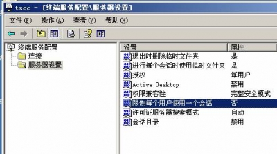 ![]() 使用安裝向?qū)?,”下一步”?br> ![]() 輸入許可證密鑰包ID為:KJ8GW - 2T4Y8 - 73QH4 - FWGYR - BWP29 - J7BXP – DYHBV,”下一步”: ![]() 點(diǎn)擊”完成”,完成終端服務(wù)的激活: ![]() 點(diǎn)擊“開始”->“程序”->“管理工具”->,打開”終端服務(wù)器配置”,在服務(wù)器配置中,默認(rèn)情況下”限制每個(gè)用戶使用一個(gè)會(huì)話” 是啟用的,在這里我們選擇否。 ![]() 四 遠(yuǎn)程桌面多用戶連接數(shù)測(cè)試