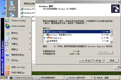 這時(shí),打開你的控制面板,并點(diǎn)擊"添加刪除程序"圖標(biāo),之后點(diǎn)擊"添加刪除Windows組件",你應(yīng)該可以看見圖一的界面。請仔細(xì)看,在開始菜單中顯示的操作系統(tǒng)是Windows XP Home,但是經(jīng)過修改,已經(jīng)有了添加IIS的選項(xiàng)了。