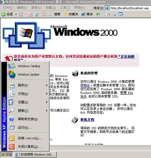 在安裝結(jié)束后,你可以打開控制面板-性能和選項(xiàng)-管理工具,"Internet信息服務(wù)管理"已經(jīng)出現(xiàn)在那里(圖二)。如果你想要驗(yàn)證IIS是否運(yùn)行正常,而已打開IE,在地址欄中輸入"http://localhost"然后回車,如果能看到圖三的界面,那么你的IIS就全部正常運(yùn)行了。