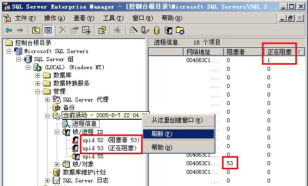 再次運(yùn)行代碼,你會發(fā)現(xiàn)程序執(zhí)行到第三步就不動了,如果你有足夠的耐心等下去的話,你會看到"超時(shí)時(shí)間已到。在操作完成之前超時(shí)時(shí)間已過或服務(wù)器未響應(yīng)。"的一條提示,這條提示究竟是什么意思呢?讓我們探察一下究竟發(fā)生了什么: 第一步,在做這個(gè)實(shí)驗(yàn)之前,先將SQL Server 2000的企業(yè)管理器打開,然后再將SQL Server事件探察器打開并處于探察狀態(tài)。 第二步,運(yùn)行改動后的程序,程序執(zhí)行到一半就暫停了。此時(shí)迅速切換到企業(yè)管理器界面,右擊"管理"下面的"當(dāng)前活動",選擇"刷新"(整個(gè)過程應(yīng)在大約15秒內(nèi)完成即可,如圖 2-8所示),我們便得到了數(shù)據(jù)庫當(dāng)前進(jìn)程的一個(gè)快照。