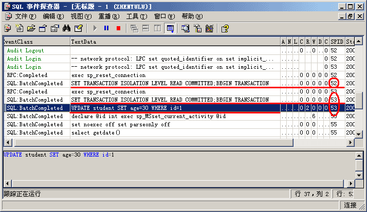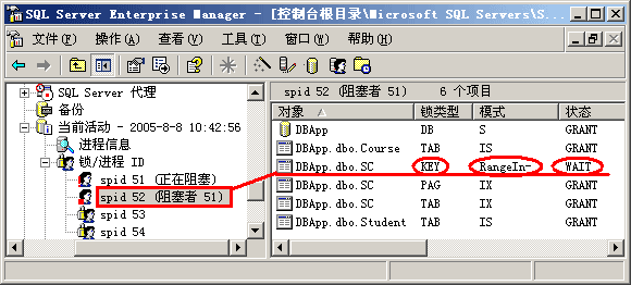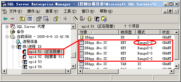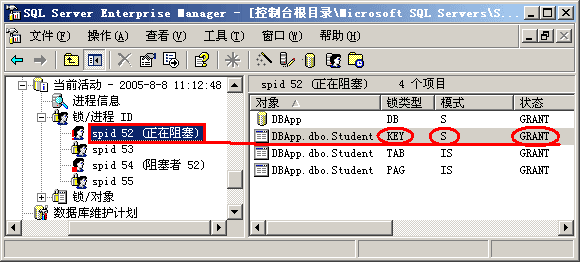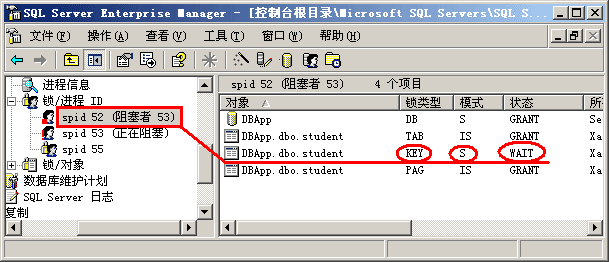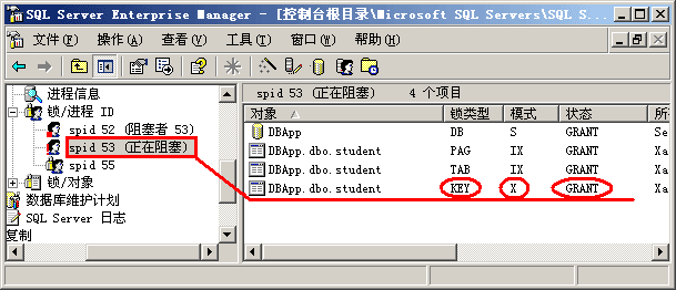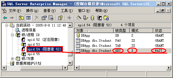 圖 2-9 事件探察器探察阻塞命令 第四步,了解了上面發(fā)生的事情后,我們現(xiàn)在可以深入討論一下共享鎖和排它鎖的使用情況了。重新回到企業(yè)管理器界面,讓我們查看一下兩個(gè)進(jìn)程各占用了什么資源。從圖 2-10中我們可以看出,53號進(jìn)程(事務(wù)2)在執(zhí)行更新命令前對相應(yīng)的鍵加上了排它鎖(X鎖),按照前文提到的1級封鎖協(xié)議,該排它鎖只有在事務(wù)2提交或回滾后才釋放?,F(xiàn)在52號進(jìn)程(事務(wù)1)要去讀同一行數(shù)據(jù),按照2級封鎖協(xié)議,它要首先對該行加共享鎖,然而 該行數(shù)據(jù)已經(jīng)被事務(wù)2加上了排它鎖,因此事務(wù)1只能處于等待狀態(tài),等待排它鎖被釋放。因此我們就看到了前面的"阻塞"問題。