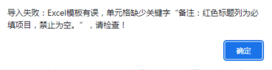 情況描述:批量導(dǎo)入物料時(shí)提示:“導(dǎo)入失敗 Excel模板有誤,單元格缺少關(guān)鍵字“備注 紅色標(biāo)題列為必填項(xiàng)目,禁止為空?!?,請檢查!”
