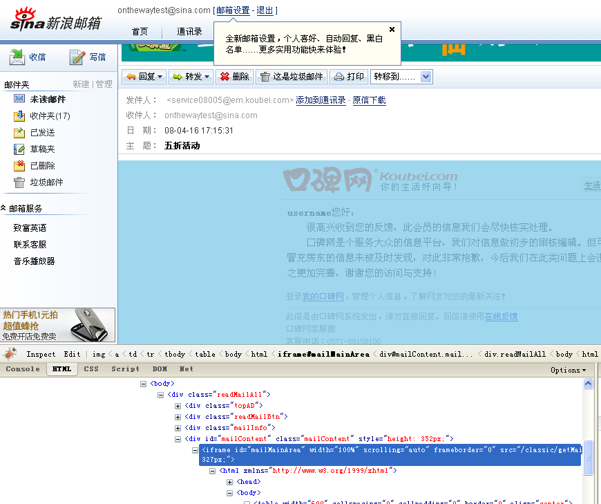 首先,我們先來(lái)看看郵箱是如何展現(xiàn)HTML郵件的。我本人沒(méi)有做過(guò)郵件系統(tǒng),況且各大郵箱后臺(tái)的過(guò)濾算法也不是那么容易可以讓外人知道的。所以,我們只能通過(guò)前端展現(xiàn),來(lái)推測(cè)哪些是被郵箱接受的寫法,而哪些又是會(huì)被過(guò)濾掉的。通過(guò)對(duì)gmail、hotmail、163、sohu、sina幾個(gè)郵箱的分析,我把郵箱分為兩類: 第一類包括gmail、hotmail、sohu,這類郵箱,郵件內(nèi)容是被布局在整個(gè)郵箱頁(yè)面中的某個(gè)div中。如圖: ![]() 第二類,包括163、sina,這類郵箱,郵件內(nèi)容被布局在獨(dú)立的iframe中。如圖: ![]() 熟悉HTML的朋友都知道,iframe內(nèi)容是作為獨(dú)立的document,與父頁(yè)面的元素和CSS是互不相干的,幾乎可以作為一個(gè)獨(dú)立的頁(yè)面來(lái)對(duì)待。而如果如果郵件內(nèi)容是在div中,那么郵件內(nèi)容是作為整個(gè)郵箱頁(yè)面的一個(gè)組成部分。顯然,以iframe作為展現(xiàn)方式的郵箱,對(duì)郵件內(nèi)容就會(huì)寬容許多,因?yàn)樗o了你一個(gè)足夠獨(dú)立的表現(xiàn)空間。而div就不是那么客氣了。試想一下,如果你在你的郵件里寫上這么一句CSS,是不是整個(gè)郵箱的展現(xiàn)頁(yè)面上字體都變成20px而因此亂了套: 我們需要寫兼容各郵箱的統(tǒng)一郵件模板,那么必然就要避開(kāi)以上這種外聯(lián)CSS寫法,另外類似于float、position等成非正常內(nèi)容流的style也會(huì)被過(guò)濾,假如你寫了,很可能會(huì)影響到外部郵箱的表現(xiàn)。 下面我列出一些編寫原則: 1、全局規(guī)則之一,不要寫<STYLE>標(biāo)簽、不要寫class,所有CSS都用style屬性,什么元素需要什么樣式就用style寫內(nèi)聯(lián)的CSS。 2、全局規(guī)則之二,少用圖片,郵箱不會(huì)過(guò)濾你的img標(biāo)簽,但是系統(tǒng)往往會(huì)默認(rèn)不載入陌生來(lái)信的圖片,如果用了很多圖片的郵件,在片沒(méi)有載入的情況下,丑陋無(wú)比甚至看不清內(nèi)容,沒(méi)耐心的用戶直接就刪除了。圖片上務(wù)必加上alt。 3、不要在style里面寫float、position這些style,因?yàn)闀?huì)被過(guò)濾。那么如何實(shí)現(xiàn)左右布局或者更復(fù)雜的布局呢?用table。 4、style內(nèi)容里面background可以設(shè)置color,但是img會(huì)被過(guò)濾,就是說(shuō)不能通過(guò)CSS來(lái)設(shè)置背景圖片了。但是有一個(gè)很有意思的元素屬性,也叫background,里面可以定義一個(gè)圖片路徑,這是個(gè)不錯(cuò)的替代方案,雖然這樣功能有限,比如無(wú)法定位背景圖片了,有總比沒(méi)有好。例如要給一個(gè)單元格加一個(gè)背景,必須這樣寫: <TD background="”http://image1.koubei.com/images/common/logo_koubei.gif”"></TD> 5、div模式的郵箱不支持flash,iframe模式的有待驗(yàn)證。 最后提一句,sohu的郵箱很怪異,會(huì)在每個(gè)文本段后面加一個(gè)空格,導(dǎo)致原本正常的排版一行放不下而換行,從而使某些布局錯(cuò)亂。所以,如果你要兼容sohu郵箱的話,遇到一些緊湊的布局就要格外小心了,盡量減少文本段的數(shù)量,留足寬度。 該文章在 2011/3/10 0:53:00 編輯過(guò) |