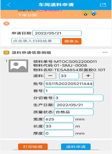 1. 當(dāng)工單生產(chǎn)結(jié)束時(shí),若有剩余物料時(shí),則需要進(jìn)入申請退料.在本界面點(diǎn)擊攝像頭,掃描剩余物料上的標(biāo)簽,然后填寫剩余的數(shù)量上去,最后點(diǎn)擊退料申請