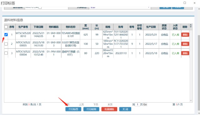 然后在彈出的窗口勾選出要打印的退料標(biāo)簽,最后重新貼上在物料上.