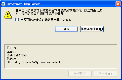 resizeTo.htm: <html> <head> <meta http-equiv="Content-Type" content="text/html; charset=gb2312" /> <title>js調(diào)整瀏覽器窗體大小測(cè)試-Mzwu.Com</title> </head> <body> <script type="text/javascript"> resizeTo(556,393); alert("www.mzwu.com"); </script> </body> </html> 調(diào)用代碼: <iframe src="http://code.5k3g.com/resizeTo.htm" width="600" height="600" frameborder="0" scrolling="no"> IE7報(bào)錯(cuò):
